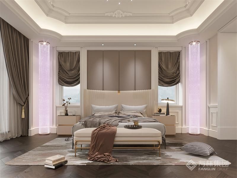 "采用美式风格的主基调,融合现代艺术风格的特征,重视常住人口的生活体验,将空间重新分配,把公区打造成足够开敞且不失仪式感的半接待半居住空间。把静区打造成相互独立,功能齐备的套房空间。"