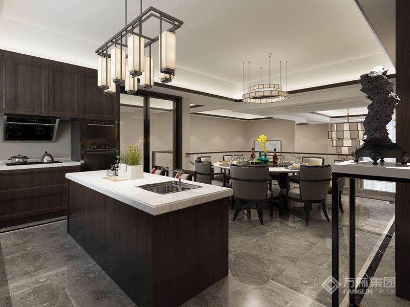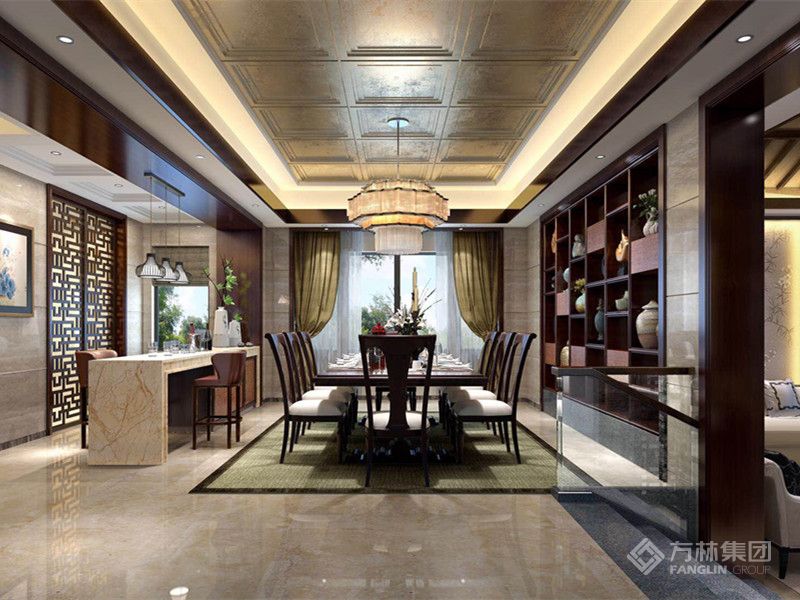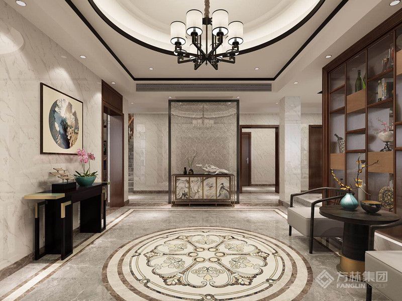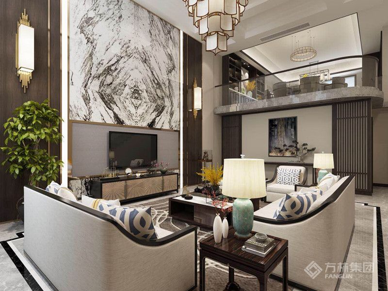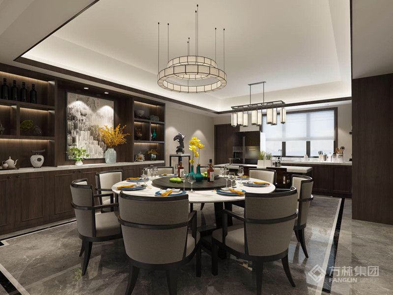 本案户型三层联排别墅,主要风格为新中式风格,客厅挑空,更好采光,更能凸显别墅高档气质,以灰白棕色为主调,多彩色系的家具综合搭配,以地面的灰色作为连接,整体协调,有趣。背景墙大理石更显装修档次,餐厅摆放圆桌可多人用餐,更好营造家庭氛围