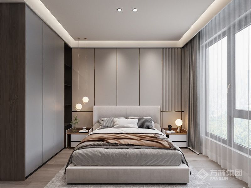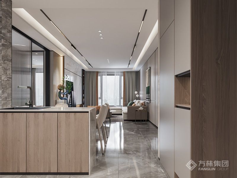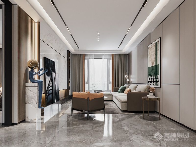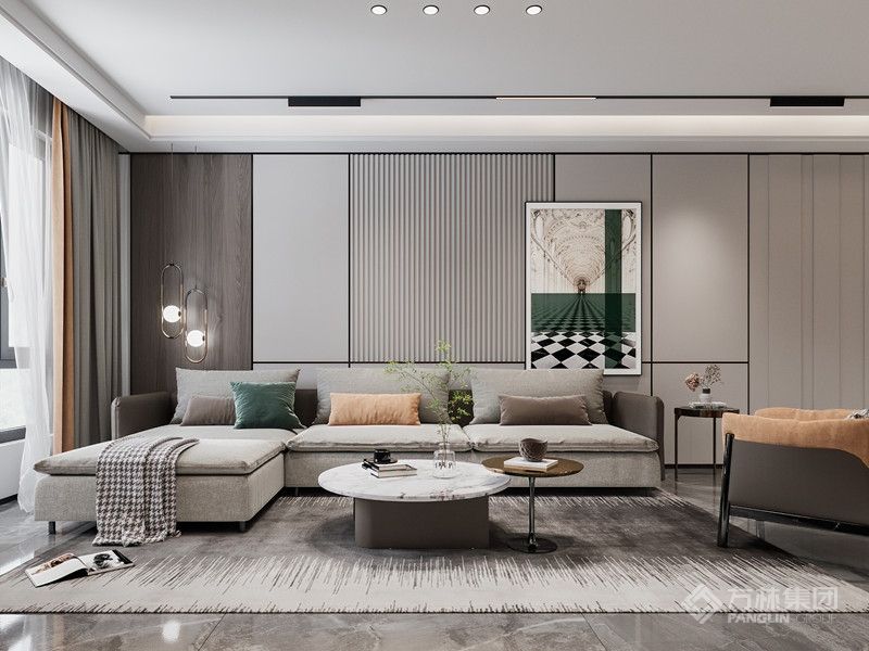 户型开间较大,以浅蓝色为主调,多彩色系的家具综合搭配,以地面的灰色作为连接,整体协调,有趣。植物元素从挂画内容到盆栽,虚实共存有较好的连接作用及主题感……