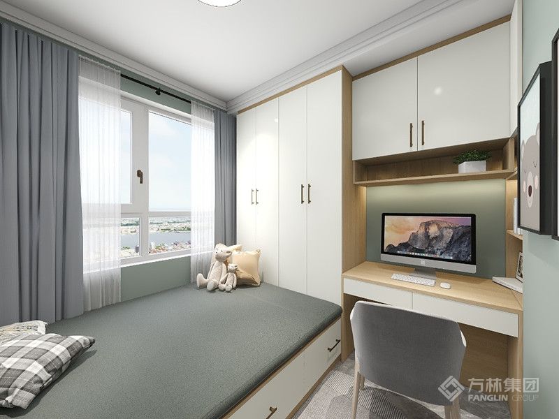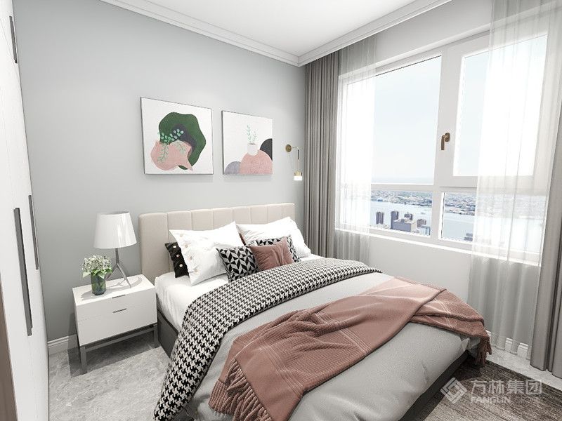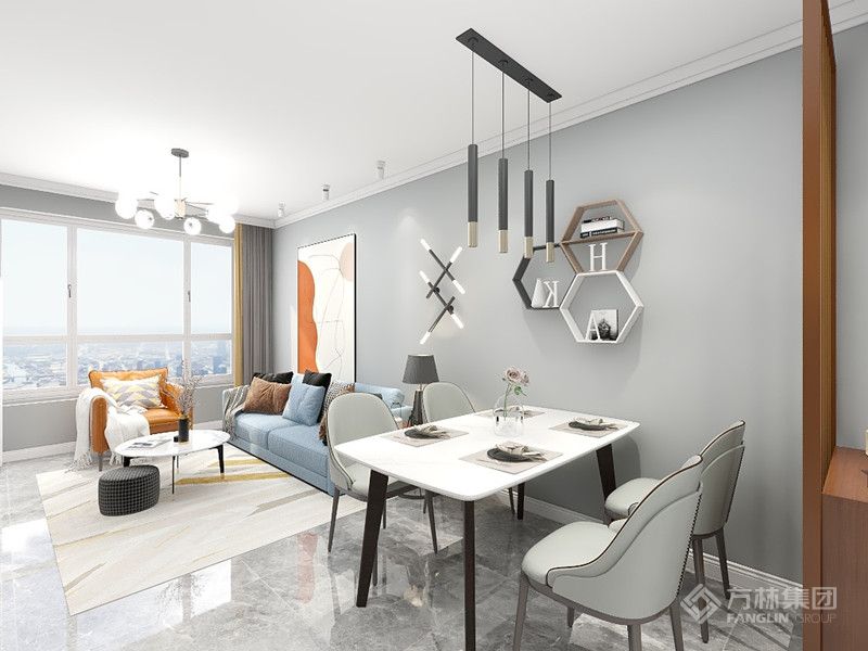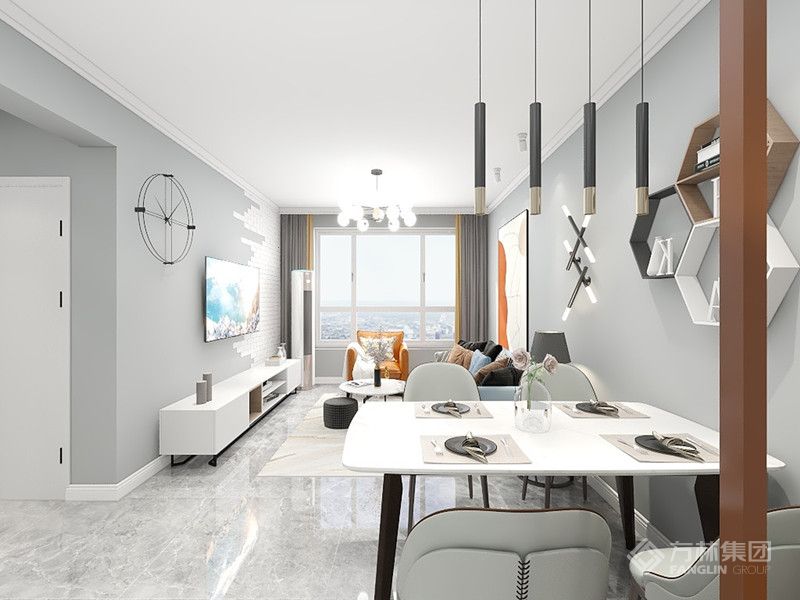 "本案各个功能区域划分合理,充分利用空间的同时又有十足的动线。采用开放式客厅,客厅、餐厅和厨房的完美融合,两个阳台相对,不仅保证了采光,而且显得大气十足。空间以灰色、白色、原木色为主色调,辅以暖橘色、墨绿色和些许粉色作为点缀,整个空间显得自然舒适,又不失格调时尚感"