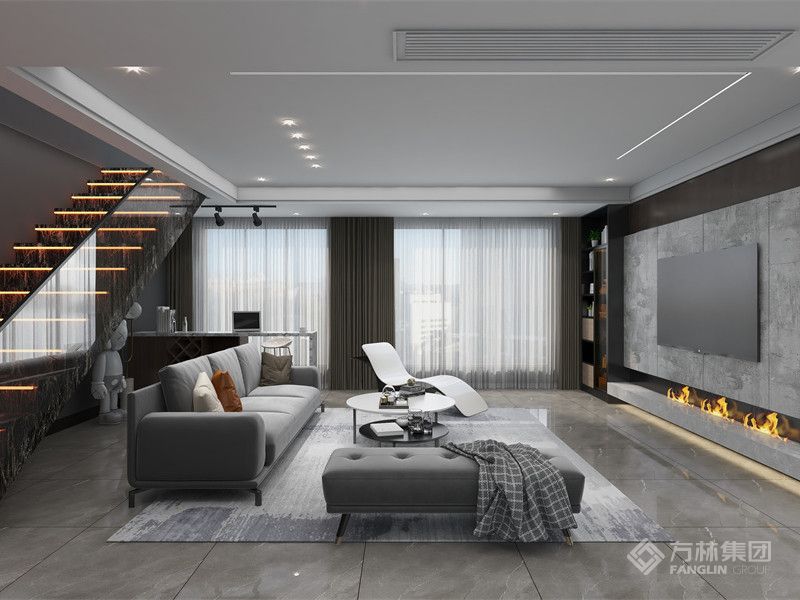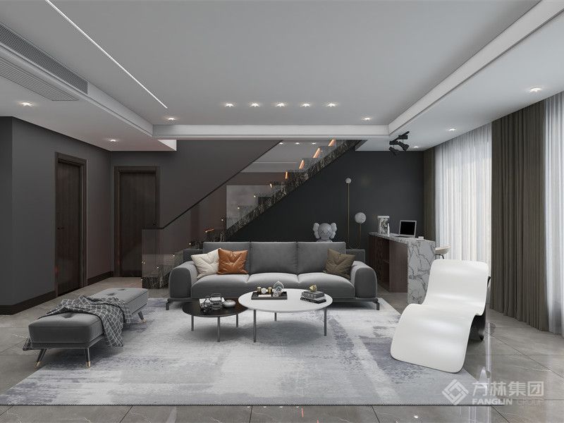 "本案各个功能区域划分合理,充分利用空间的同时又有十足的动线。采用开放式客厅,客厅、餐厅和厨房的完美融合,两个阳台相对,不仅保证了采光,而且显得大气十足。空间以灰色、白色、原木色为主色调,辅以暖橘色、墨绿色和些许粉色作为点缀,整个空间显得自然舒适,又不失格调时尚感"