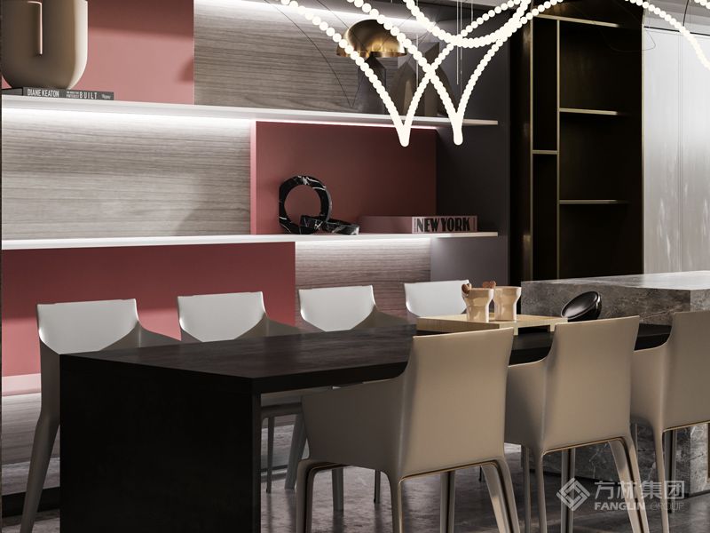 充满质感的材料搭配、格调的空间、点、线光照明舒适温暖的家居氛围、适度的软装搭配搭配、功能布局的精细搭配符合日常的生活需求。