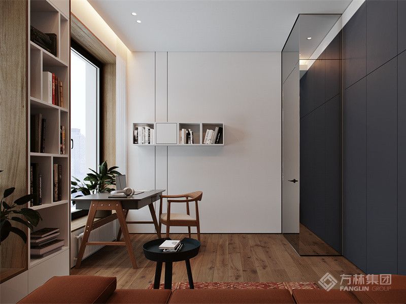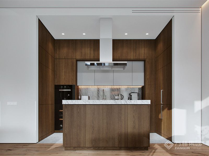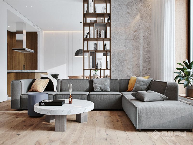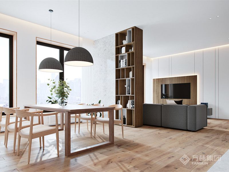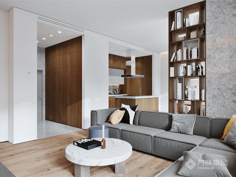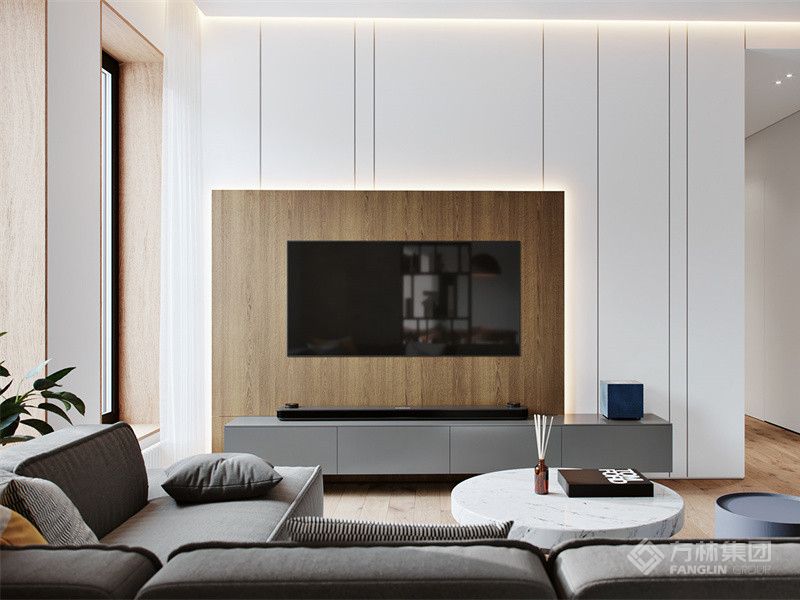 在墙布与原木木饰面的不规则双拼下,赋予了节奏感,没有挂画的客厅,没有了累赘感看起来更加轻盈。
