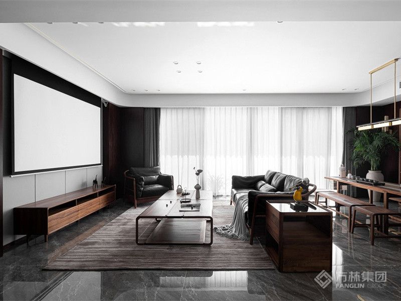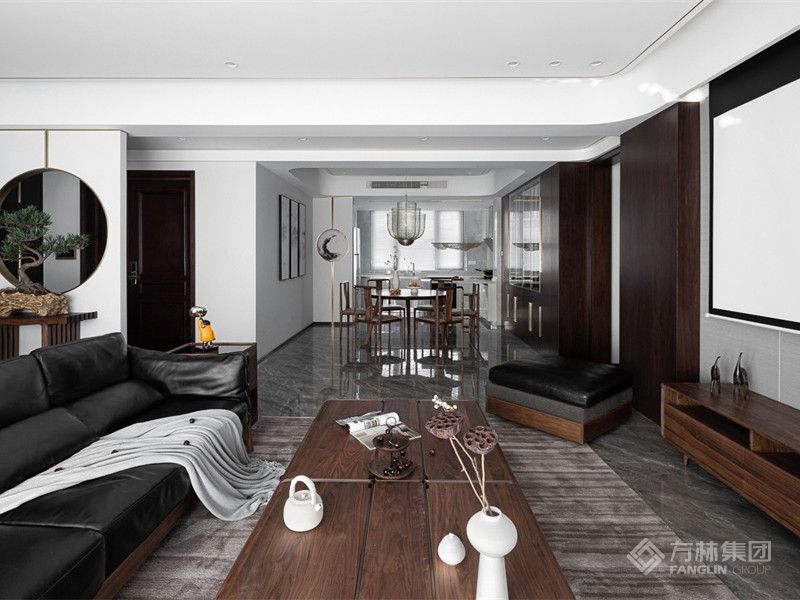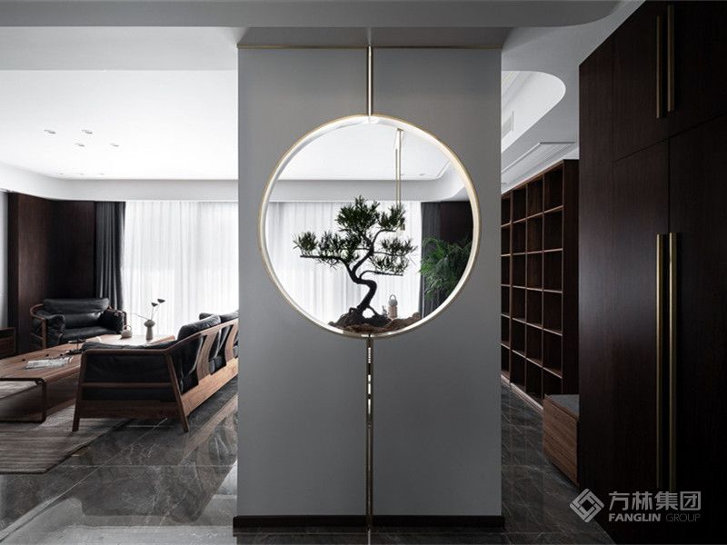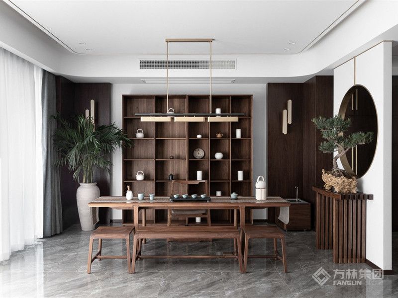 餐厅次背景同客厅背景贯通连续,凹位底层展示大理石天然纹理;陈设条案,呼应圆屏杭绣锦鲤图成为一处小景,酝酿绵延悠长的东方情致。
