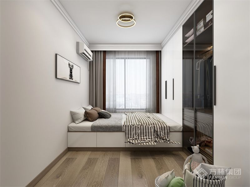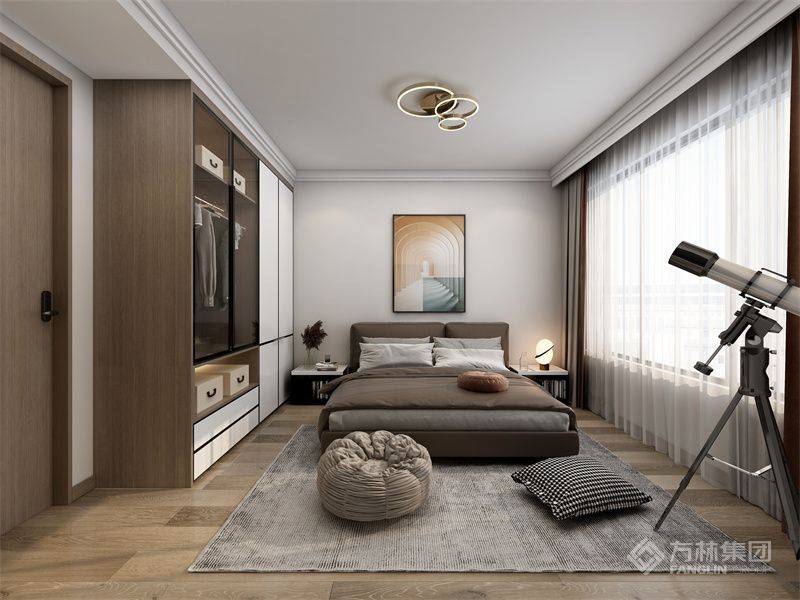 • 主卧设计旨在干净舒适。奶咖色的墙面搭配浅灰色窗帘,布艺软床搭配柔软亲肤的床品。透明亚克力材质的床头柜饰以精巧的摆件,为空间增添了几分精致,使卧室空间显得和谐、有层次。
