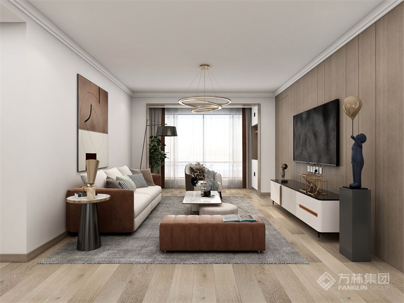 在墙布与原木木饰面的不规则双拼下,赋予了节奏感,没有挂画的客厅,没有了累赘感看起来更加轻盈。