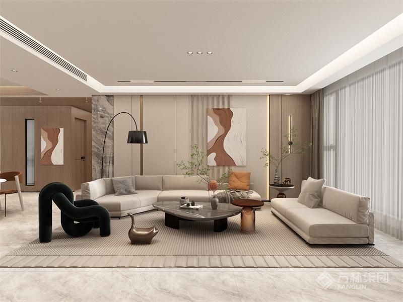 在墙布与原木木饰面的不规则双拼下,赋予了节奏感,没有挂画的客厅,没有了累赘感看起来更加轻盈。