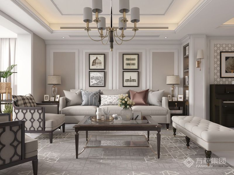 "追求华丽、高雅的古典风格。居室色彩主调为白色,家具为古典弯腿式,家具、门、窗漆成白色,擅用各种花饰、丰富的木线变化、富丽的窗帘帷幄是西式传统室内装饰的固定模式,空间环境多表现出华美、富丽、浪漫的气氛。 "
