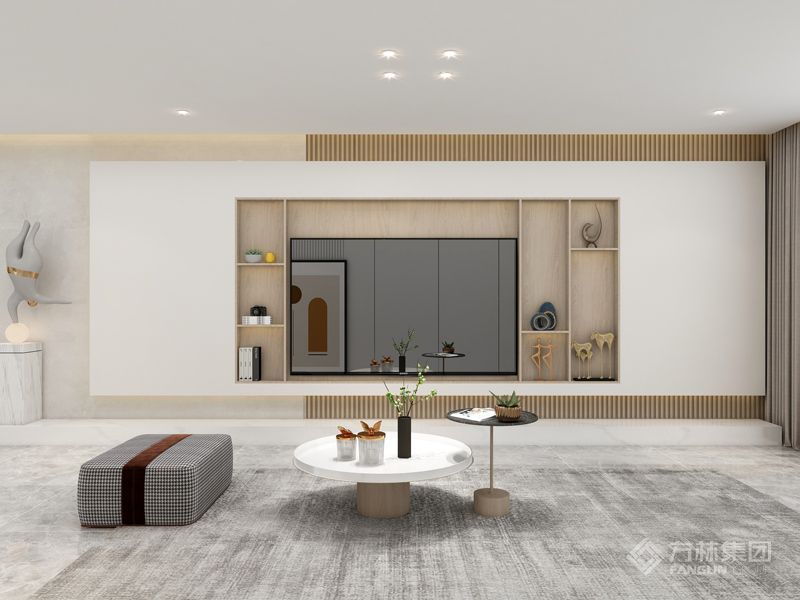 在墙布与原木木饰面的不规则双拼下,赋予了节奏感,没有挂画的客厅,没有了累赘感看起来更加轻盈。