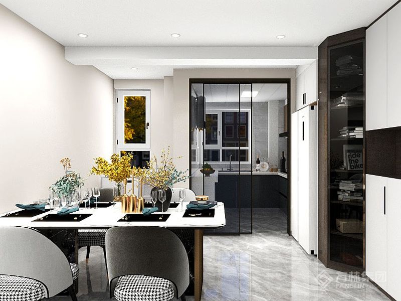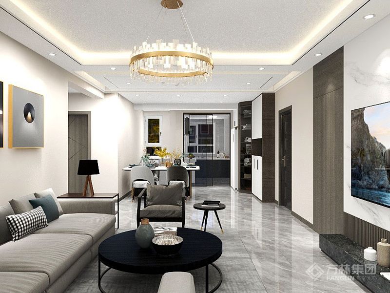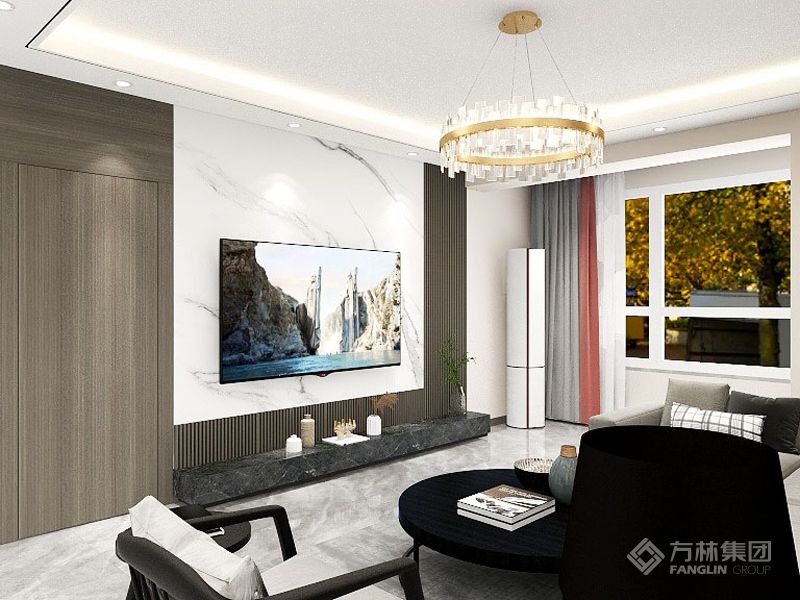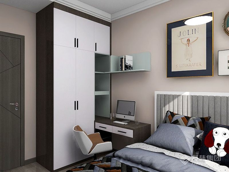 本案客户是年轻夫妻,有一个男孩,以后考虑要二胎,所以三室都保留卧室功能。电视背景墙比较小,并且连着南次卧室的门,所以考虑设计成隐形门和背景墙一体,视觉上延伸背景墙的长度,材质以木饰面搭配岩板。