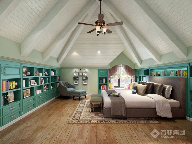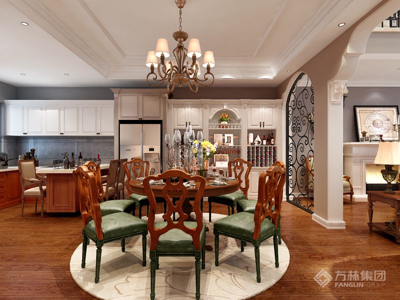 "稳的低饱和度色彩,壁炉式的电视背景墙,腔调满满的石膏吊顶,撩动窗帘,阳光倾泻而入,美式的高级感在和风中徐徐展开。生机盎然的绿植,营造活力十足的空间氛围,蓝绿色单人皮沙发气质满满,这种富于雅趣的生活氛围,更能体现出主人对居家生活的高品质追求。 "