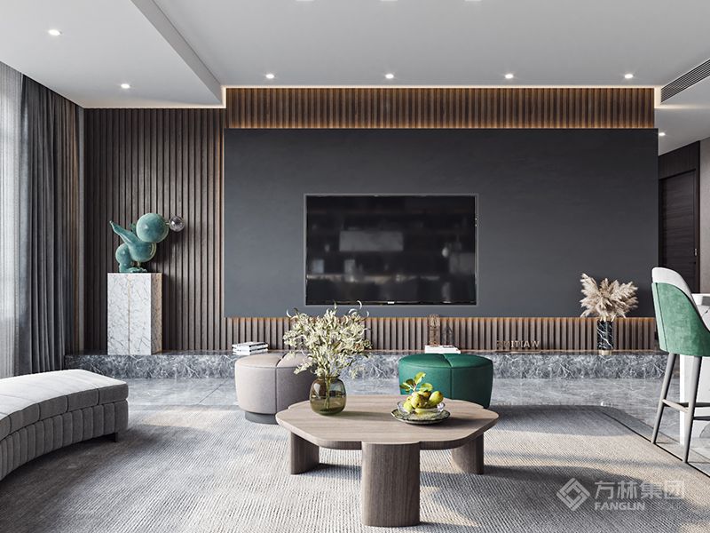 在墙布与原木木饰面的不规则双拼下,赋予了节奏感,没有挂画的客厅,没有了累赘感看起来更加轻盈。