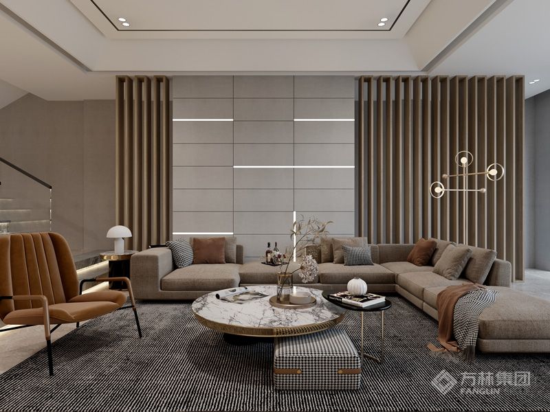 在墙布与原木木饰面的不规则双拼下,赋予了节奏感,没有挂画的客厅,没有了累赘感看起来更加轻盈。