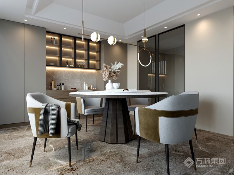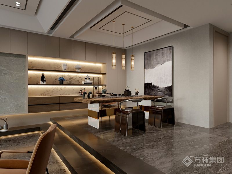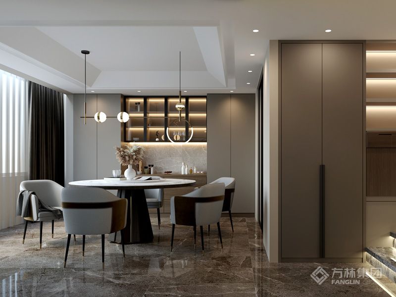 本案是现代中式设计,以现代人的审美需求打造富有传统韵味的空间。家具材质沉稳,呈现东方情调,空间整体感更轻松自然。