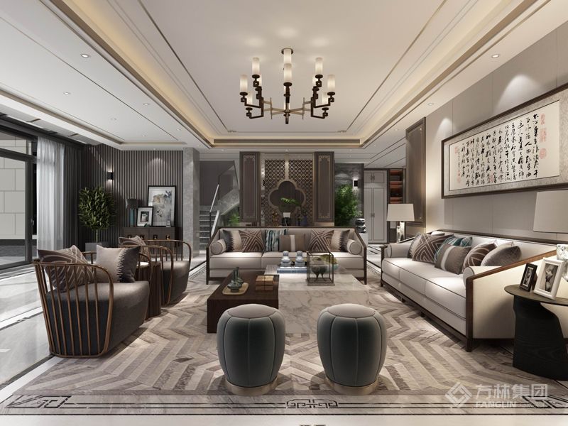 设计采用现代融合中式的手法,设计灵感部分来源于大自然,从自然中取形取意,打造一个现代时尚而不失儒雅、又具有原创独特个性和内涵的高品位家居空间。