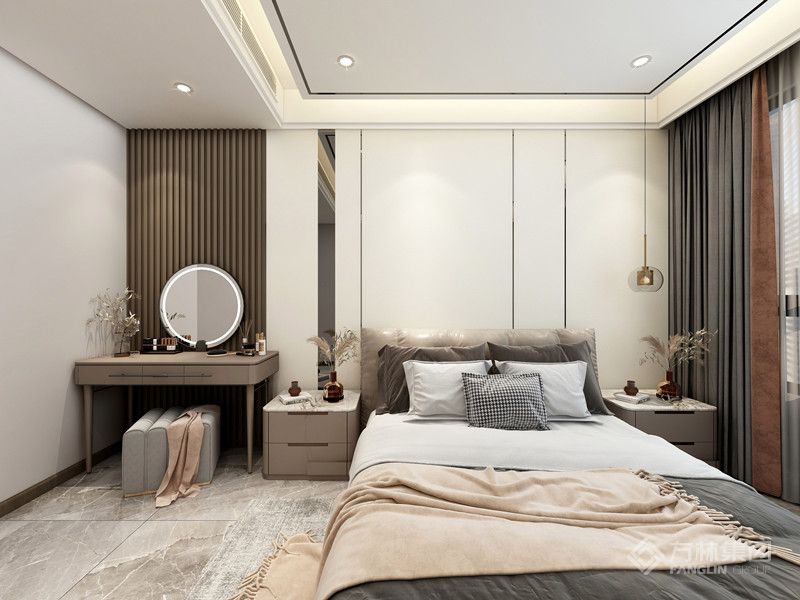 "本案各个功能区域划分合理,充分利用空间的同时又有十足的动线。采用开放式客厅,客厅、餐厅和厨房的完美融合,两个阳台相对,不仅保证了采光,而且显得大气十足。空间以灰色、白色、原木色为主色调,辅以暖橘色、墨绿色和些许粉色作为点缀,整个空间显得自然舒适,又不失格调时尚感"