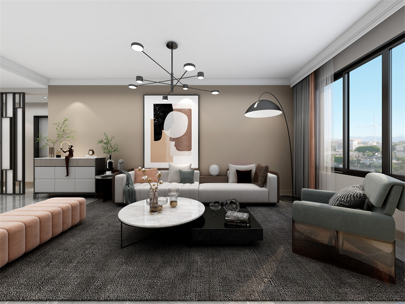 本案是现代中式设计,以现代人的审美需求打造富有传统韵味的空间。家具材质沉稳,呈现东方情调,空间整体感更轻松自然。